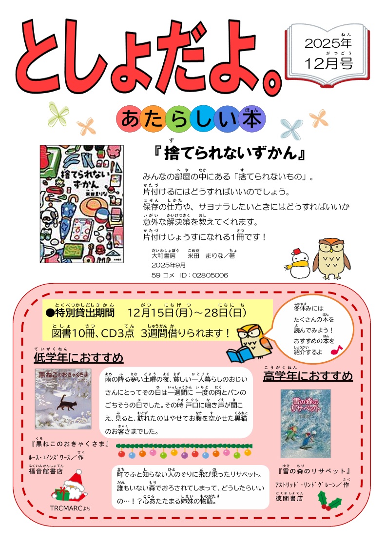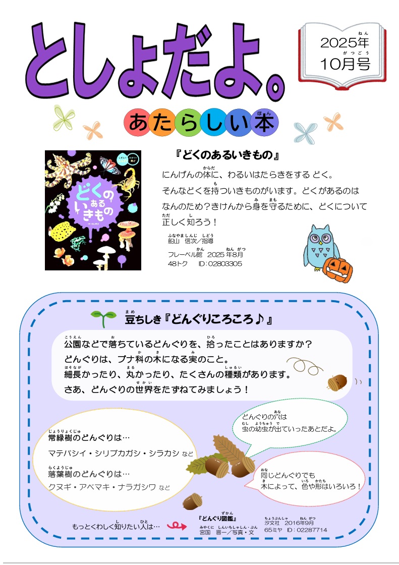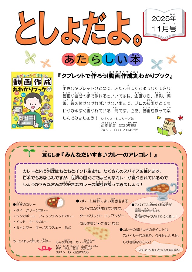 画像をクリックしてください。全ページが表示されます。 【NEW】としょだよ。2025年11月号 としょだよ。2025年10月号 としょだよ。2025年9月号 としょだよ。2025年7・8月合併号 としょだよ。2025年6月号 としょだよ。2025年5月号 としょだよ。2025年4月号 としょだよ。2025年3月号 としょだよ。2025年1月2月合併号