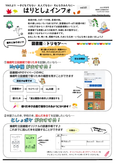 画像をクリックすると、全てのページを読むことができます。 【NEW】はりとしょインフォ2025年秋号 はりとしょインフォ2025年夏号 はりとしょインフォ2025年春号 はりとしょインフォ2025年新春号 はりとしょインフォ2024年秋号 はりとしょインフォ2024年夏号 はりとしょインフォ2024年春号
