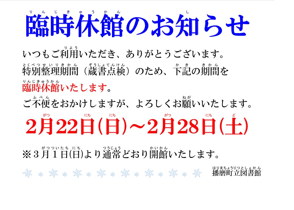 特別整理期間(蔵書点検)のため、下記の期間は臨時休館いたします。