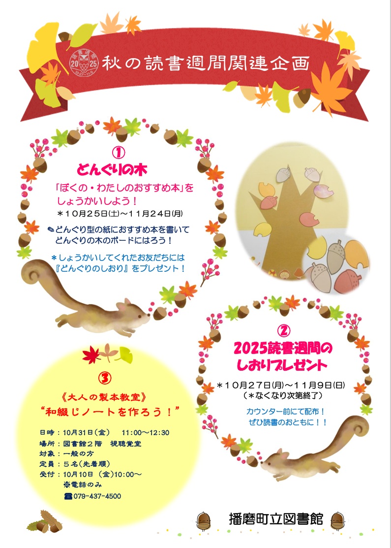 ★どんぐり型の紙におすすめ本を書いて、どんぐりの木のボードに貼ろう!参加者には「どんぐりのしおり」をプレゼント!