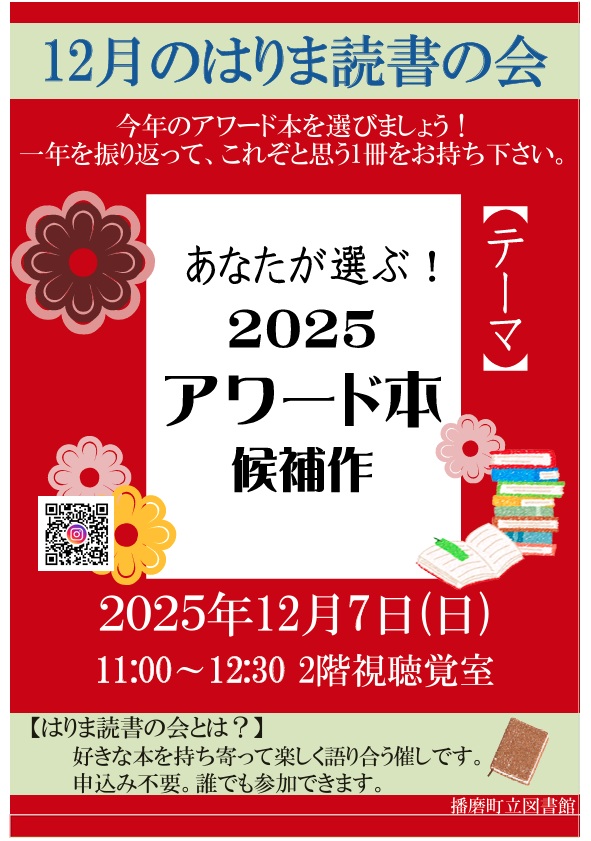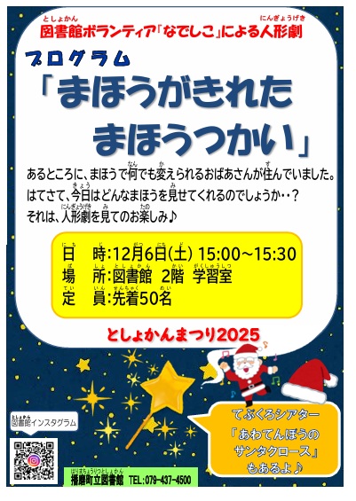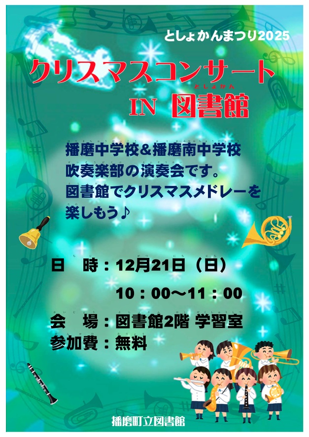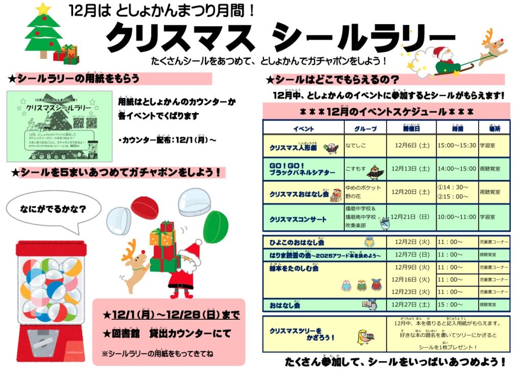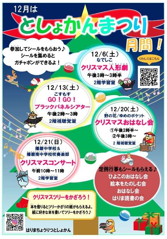 12月は図書館ボランティアによるクリスマスおはなし会や人形劇、ブラックパネルシアター、播磨中学校&播磨南中学校吹奏楽部のクリスマスコンサートなど、楽しいイベントが盛りだくさん。