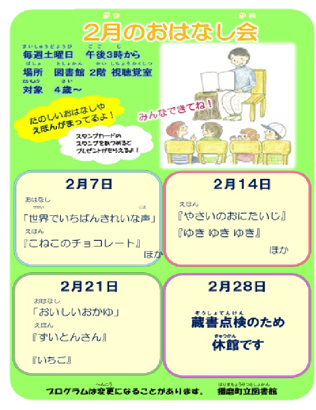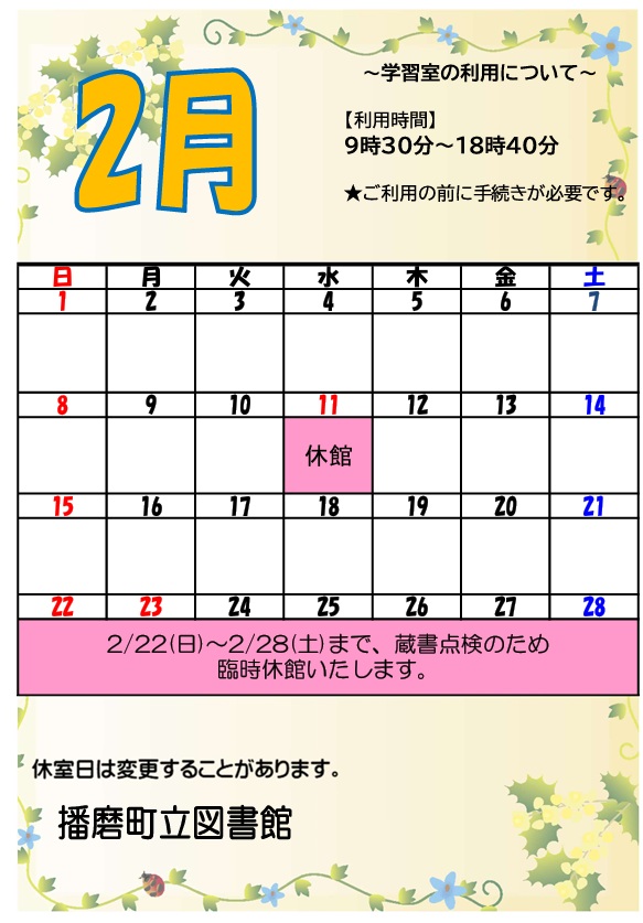 2月22日(日)から28日(土)まで、蔵書点検に伴い臨時休館いたします。