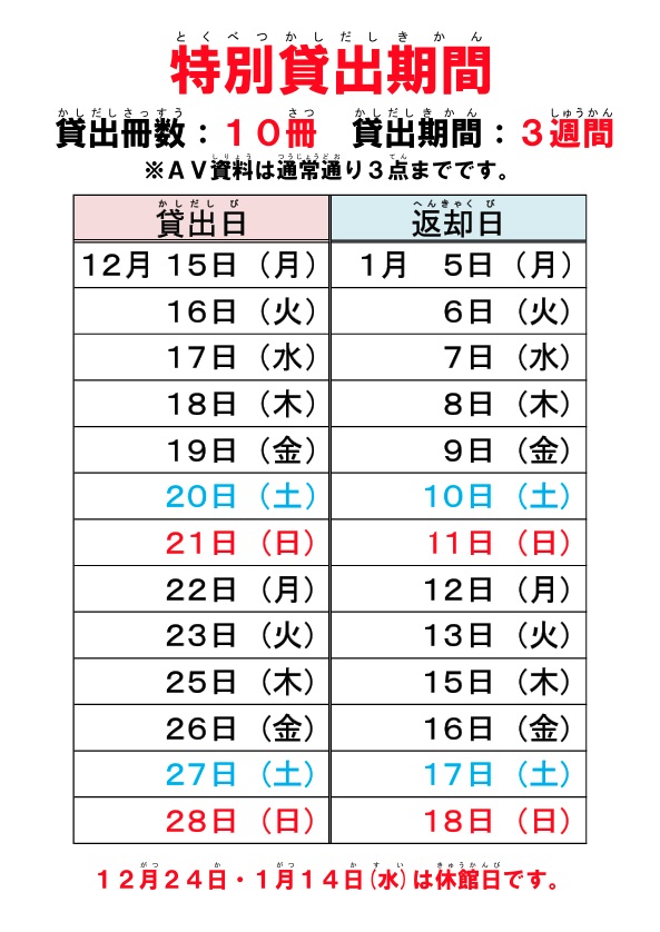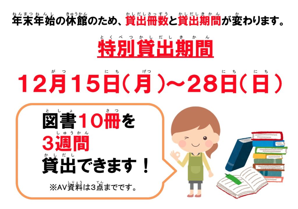 年末年始の休館に伴い、下記の期間に限り貸出期間を3週間に延長いたします。また、図書の貸し出し冊数を10冊までに変更します。※視聴覚資料は3点までです。